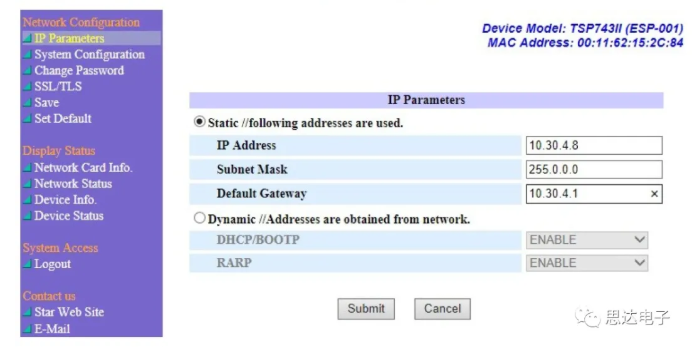 點擊“System Access”—“Login”按鈕,使用如下管理員賬號登錄可以對打印機配置進行修改和保存。用戶名:root,密碼:public點擊“IP Parameters”,選擇靜態或者動態IP 地址,如果使用靜態IP 地址,輸入IP 地址、子網掩碼、網關等參數,點擊“Submit”按鈕。如下圖所示。