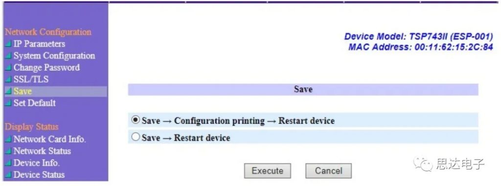 對打印機做任何配置變更后,需要點擊“Save”—“Execute”,重啟設備后生效。設置完打印機會打印出IP設置成功的紙出來。